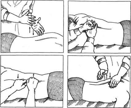 мые мышцы (например, бедра), большие пальцы располагают сверху мышцы, а остальные — снизу. Большими пальцами надавливают, отжимают мышцу, а остальными подталкивают (сдавливают) ее снизу. Движения поступательные, мягкие, плавные.