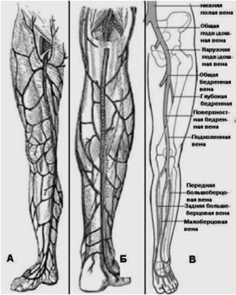 Поверхностные подкожные вены нижних конечностей имеют два магистральных коллектора. Большая подкожная вена (рис. 2А) начинается на медиальной стороне тыла стопы, где называется медиальной краевой веной; поднимается кпереди от медиальной лодыжки на голень, располагаясь на ее передневнутренней поверхности; огибает сзади медиальный надмыщелок бедра; поднимется по бедру до скарповского треугольника и паховой связки.