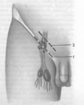 Доступ выполняется на 2 см выше паховой складки и параллельно ей. Кожу рассекают в медиальном направлении от точки пульсации бедренной артерии к лонному сочленению (рис. 3). Острым путем послойно рассекают кожу, подкожную клетчатку и томпсонову фасцию. Сразу же под ней, в верхней трети оперативного разреза обнаруживают артерию и вену. Последняя известна как поверхностная надчревная вена. Указанный сосуд является наиболее постоянным приустьевым притоком большой подкожной вены, впадающим в нее в верхней полуокружности сафенофеморального соустья. Тщательно выделяя поверхностную надчревную вену в дистальном направлении, обнаруживают устье большой подкожной вены. После мобилизации сафенофеморального соустья и пересечения обнаруженных приустьевых притоков большую подкожную вену отсекают от бедренной и дважды прошиванием перевязывают на уровне крепления створок остиального клапана, т.е. пристеночно по отношению к бедренной вене.