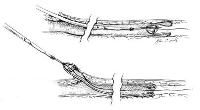 Второй способ заключается в применении особого тонкого жесткого металлического зонда (PIN-зонд, PIN-стриппинг), который вместо оливы имеет специальное отверстие для фиксации нити. При PIN-стриппинге требуется один разрез в паху (после кроссэктомии), зонд с фиксированной на нем нитью проводится по просвету всего удаляемого сегмента и через небольшой прокол на голени выводится наружу. В области головки зонда вену рассекают, нить выводят через отверстие и завязывают на вене. Таким образом, усилия хирурга через фиксированную нить передаются на вену, вызывая ее выворачивание и удаление (рис. 4). Через прокол на голени вена легко извлекается. Главным достоинством PIN-стрипинга является отсутствие полноценного разреза (а значит, и швов) на голени, что улучшает эстетический результат операции. В целом инвагинационная сафенэктомия ассоциируется с меньшим травмированием тканей, незначительным риском развития осложнений, лучшим косметическим эффектом (небольшие кровоизлияние),отсутствием чувствительных расстройств. Однако методика сопряжена с более высоким риском технических неудач во время операции (высокий риск отрыва вены и необходимость дополнительных разрезов для удаления оставшихся сегментов), поэтому не рекомендуется к применению в случаях запущенной варикозной болезни (при диаметре вены более 1 см).