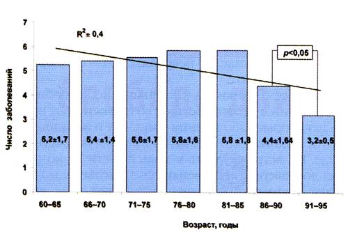 Оказалось, что показатель "число заболеваний/один больной" недостоверно возрастает от 60 к 85 годам, составляя соответственно 5,1 и 5,8, но оказывается достоверно меньшим в старейших группах (4,7 в группе 86–90 лет и 2,9 в группе 91–95 лет; рис. 1) [6].