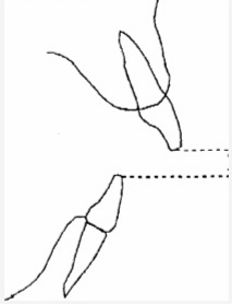 Переднее нижнечелюстное перекрытие. Оценивают этот признак, когда любой нижний резец выдвинут вперед или вестибулярно по отношению к противоположно находящемуся верхнему резцу. Регистрируют самое большое выдвижение зуба вперед (в мм). Измерения проводят так же, как и на верхней челюсти.