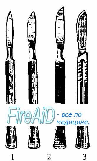 По форме лезвия различают остроконечные и брюшистые (с сильно выпуклой режущей кромкой) скальпели (рис. 2.1).