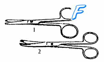 Рис. 2.3. Хирургические ножницы . 1 — остроконечные прямые ножницы; 2 — тупоконечные изогнутые ножницы.