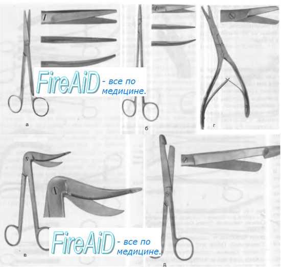 Рис. 1-9. Ножницы шарнирного типа , а — стандартная модель Мейо, б — сосудистые ножницы Келли, в — ножницы Марбаха для зпизиотомии, г — ножницы Каплана для рассечения перегородок, д — анатомические ножницы для знтеротомии.