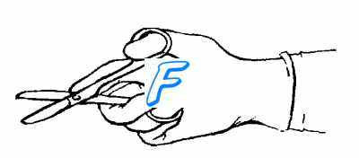 Положение ножниц в руке : ногтевая фаланга IV пальца рабочей руки находится в нижнем кольце, Ш палец лежит на кольце в месте его соединения с браншей, II палец упирается в винт. В кольце верхней бранши располагается ногтевая фаланга I пальца (рис. 2.4).