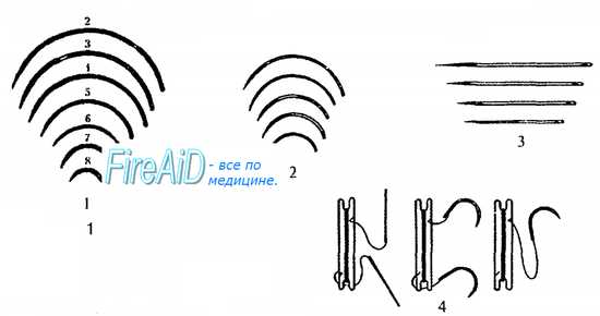 Рис. 2.13. Иглы хирургические . 1 — режущие; 2, 3 — колющие изогнутые и прямые; 4 — атрав-матические.