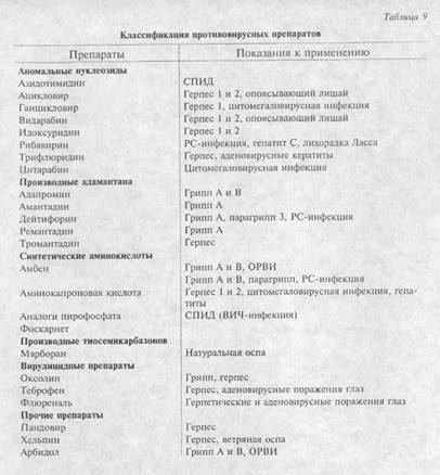 Классификация основных противовирусных химиопрепаратов приведена в ряде обобщающих эту проблему работ [Ф. И. Ершов, 1995; Н. П. Чижов, 1995 и др.], которые использованы при составлении настоящего Руководства (табл. 9). Указанные в таблице средства в большинстве своем эффективны при лечении гриппа и герпетической инфекции. К ним, к сожалению, быстро формируется резистентность, что существенно влияет на результаты лечения. При некоторых вирусных инфекциях, в частности герпетической, с обнадеживающими результатами использован препарат растительного происхождения — флакозид. Это флавоноид, полученный из растений бархата амурского и бархата Лаваля