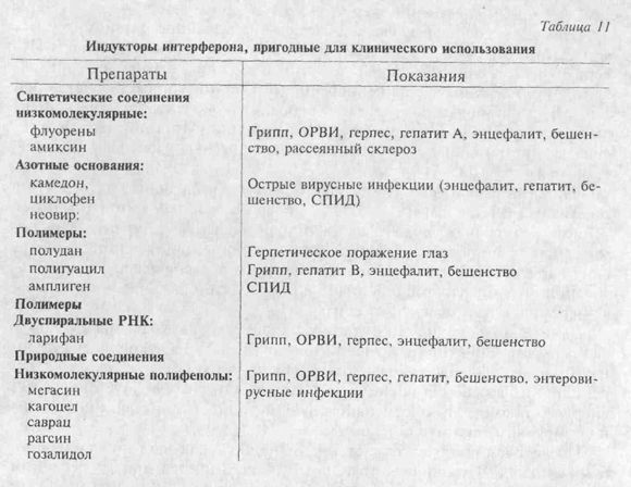 герпетическом заболевании глаз, гриппе, риновирусной инфекции и прочих заболеваниях (табл. 11). Индукторы интерферона являются новой и весьма перспективной группой противовирусных препаратов.