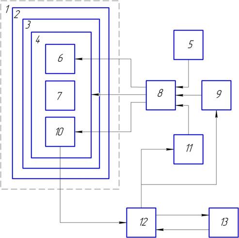 1– экранирующая камера, 2 – кожух с жидким азотом, 3 – кожух с жидким гелием, 4 – сверхпроводящий магнит, 5 – источник первичного импульса, 6 – градиентная катушка, 7 – радиочастотная катушка, 8 – блок фильтрации, 9 – источник питания градиентной катушки, 10 – предварительный усилитель, 11 – радиочастотный передатчик, 12 – крейт, 13 – ПЭВМ