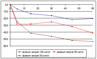 Внутрибрюшинное введение селенита натрия в дозе 30 мкг/кг (6 опытов) вызывало достоверное снижение МК с первых минут эксперимента. Так, на 5 минуте наблюдения степень снижение МК составила 25%, а на 15 минуте - 41,2% по отношению к исходному уровню. В дальнейшем МК продолжал снижаться и на 60 минуте был ниже исходного уровня на 53,7±15,8% (таблица 3).