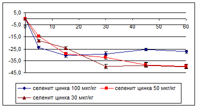 В опытах с внутрибрюшинным введением селенита цинка в дозе 50 мкг/кг также отмечалась тенденция к снижению МК. Однако достоверно МК снижался только на 45 минуте, степень его снижения составила в среднем 38,2% (таблица 7).