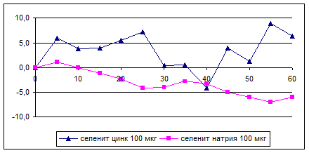 Внутрибрюшинное введение селенита натрия и селенита цинка в дозе 100 мкг/кг (6 опытов) не вызывало достоверного изменения АД по сравнению с исходным уровнем у бодрствующих животных в течение всего срока наблюдения. Однако необходимо отметить, что при введении селенита натрия отмечалась некоторая тенденция к снижению АД на 6%, а при введении селенита цинка - незначительное увеличение АД в среднем на 6%.