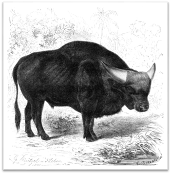 Буйвол (Рис. 2) из рода Bubalis в глубокой древности одомашнен в Индии, распространен на Кавказе, является древним и отдаленным родичем домашнего крупного рогатого скота. Крупнейшие из современных быков, живая масса – 1000 кг. Высота в холке – до 1,8 м при длине тела 3-3,4 м. Буйволы (азиатский и африканский) по строению черепа близки к антилопам и, как и они, происходят от рода эотрагус из нижнего (до среднего) миоцена Европы и Центральной Африки. Индийские лобастые быки - бантенги, гауры и гаялы. Бантенг с очень узким ареалом одомашнен на Малайском архипелаге и дал начало скоту острова Бали, гаур используется кое-где в полуодомашненном состоянии. Одомашненной формой гаура считается гаял (Рис. 3).