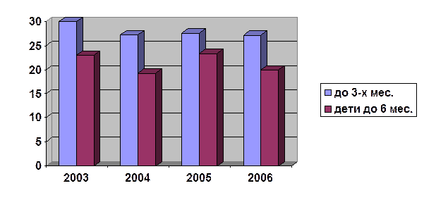 Из статистических данных видно, что 10 % детей находящихся на естественном вскармливании остается относительно стабильным. Смертность детей 1-го года снизилась по сравнению с 2003 годом, но повысилась по сравнению с 2005. Индекс здоровья детей в пределах 10%. Идет рост детей второй группы здоровья за счет уменьшения первой группы здоровья.
