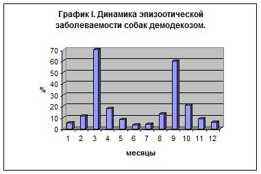 Как видно из графика I, наибольший пик инвазии наблюдают в марте (70%) и сентябре (60%), т.е. тогда когда начинается активная естественная смена волосяного покрова животных.