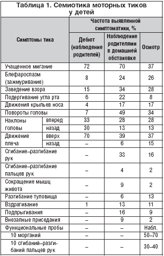 К локальному тику относятся гиперкинезы, захватывающие одну мышечную группу, в основном мимическую мускулатуру, которые проявляются в виде частого моргания, зажмуривания, клонических движений угла рта и крыльев носа (табл. 1)