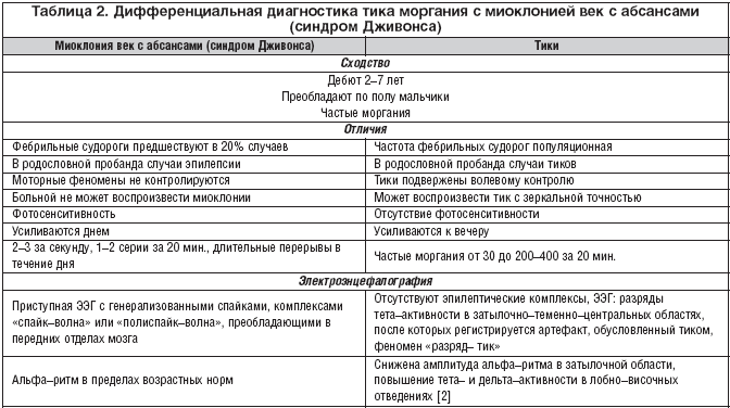 Учащенное моргание провоцируется нагрузкой на зрение (просмотр телевизора, работа на персональном компьютере). Блефароспазм напоминает моргание, но отличается тем, что в гиперкинезе присутствует дистонический компонент движений. У половины больных во время врачебного осмотра снижается выраженность тиков или они даже могут отсутствовать, в отличие от наблюдений в домашней обстановке. В связи с этим целесообразно использовать функциональные пробы: проба 10 морганий и 10 сгибаний–разгибаний пальцев рук, которые провоцируют дополнительные моргания и атетоидные движения в пальцах рук. В таблице 2 представлены сходства и различия локальных тиков и синдрома Дживонса. Миоклония век с абсансами (МВА) составляет около 2, 7% среди всех форм эпилептических синдромов с дебютом в детском возрасте и 12, 9% среди абсансных форм эпилепсии.