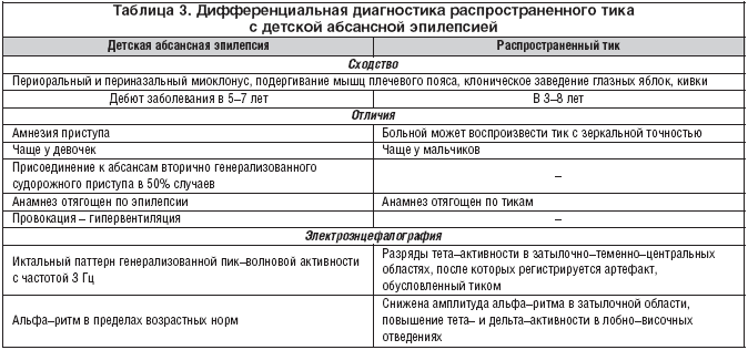 Распространенный тик – в гиперкинез вовлекаются несколько мышечных групп: мимические, мышцы головы и шеи, плечевого пояса, верхних конечностей, мышцы живота и спины; можно наблюдать заведение взора, повороты и наклоны головы (табл. 1). При распространении гиперкинеза вовлекаются мышцы шеи и головы в виде поворотов, наклонов, запрокидывания головы назад [6]. Наиболее частые сочетания непроизвольных движений: частое мигание и заведение взора; заведение взора и подергивания плеча; заведение взора и повороты головы, напоминающие миоклонус и клонус при сложных абсансах. В таблице 3 представлены сходства и различия данных состояний. Значительный эффект на локальные и распространенные тики оказывают препараты ГАМК–ергического действия, такие как аминофенилмасляной кислоты гидрохлорид (Анвифен) и гопантеновая кислота.