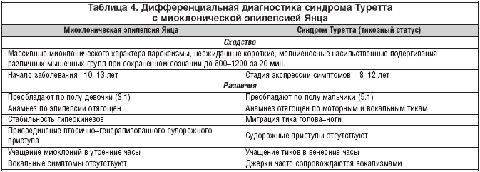Иктальные ЭЭГ–записи во время миоклонических приступов констатируют вспышки генерализованных высокоамплитудных полипиков и пик–волновых комплексов с высокой частотой – 10–16 Гц. Этим комплексам обычно предшествуют нерегулярные медленные волны. Основным методом провокации является фотостимуляция [8]. В таблице 4 представлены сходства и различия синдромов Туретта и Янца.