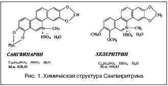 Сангвиритрин представляет собой смесь бисульфатов двух близких по структуре и свойствам четвертичных бензо[c]фенантридиновых алкалоидов – сангвинарина и хелеритрина (рис. 1).