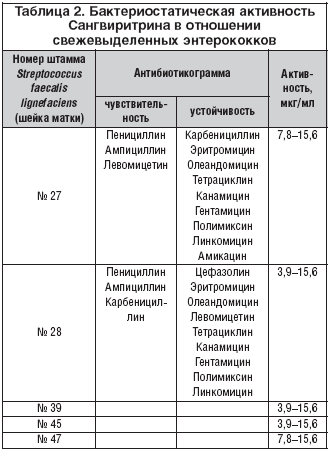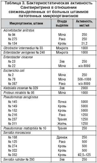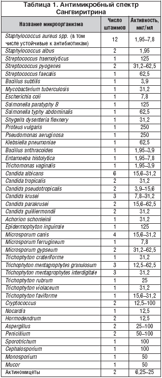 В числе положительных качеств Сангвиритрина отмечаются также отсутствие развития резистентности к нему даже при длительном применении и широкий спектр антимикробной активности, в том числе в отношении моно– и полирезистентных штаммов микроорганизмов [Вичканова С.А., 1981, 2001].
