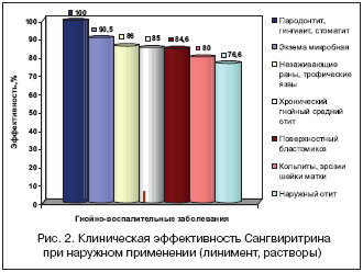 Клинические исследования Сангвиритрина в качестве наружного антимикробного средства проведены в 15 ведущих клинических учреждениях в трех лекарственных формах: 0, 2% водно–спиртовой раствор (далее – 0, 2% раствор), 1% линимент, а также 0, 001–0, 1% водные растворы, приготовляемые ex tempore.
