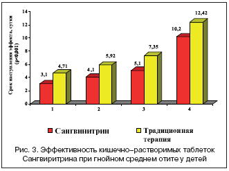 Высокая эффективность кишечно–растворимых таблеток Сангвиритрина при лечении гнойно–воспалительных заболеваний, осложненных дисбактериозом и бактерионосительством, была показана при исследовании препарата у 110 больных детского возраста (от 1 года до 15 лет) с патологией ЛОР–органов (ДГКБ №9 им. Г.Н. Сперанского). У всех больных наличие гнойно–воспалительного процесса было подтверждено бактериологическим исследованием (наличие патогенных бактерий при острых и хронических гнойных процессах и патогенных грибов при фарингомикозе). При исследовании было выявлено, что кишечно–растворимые таблетки Сангвиритрина не только положительно влияют на клиническое течение гнойно–воспалительных заболеваний ЛОР–органов у детей, но и способствуют нормализации микрофлоры, сопровождающей эти заболевания, предупреждают развитие реконвалесцентного бактерионосительства и оказывают нормализующее влияние на микрофлору при дисбактериозах, часто осложняющих течение ЛОР–заболеваний у пациентов детского возраста (рис. 3).