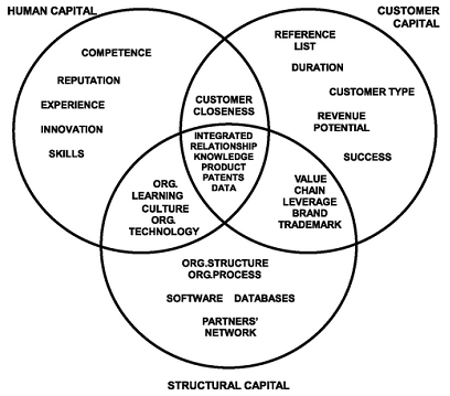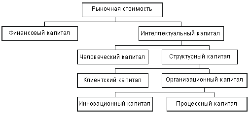 В приведенной схеме человеческий капитал рассматривается как компетенция и способности персонала компании. Эта часть интеллектуального капитала покидает компанию вместе с работниками после окончания рабочего дня. Структурный капитал — это то, что остается в компании после окончания рабочего дня и ухода работников. Он делится на клиентский и организационный капитал. Клиентский капитал представляет собой ценность, заключенную в отношениях с клиентами. Организационный капитал делится на инновационный и процессный капитал. Инновационный капитал состоит в основном из законных прав (патентов, лицензионных соглашений), а также из того, чему трудно дать точное определение, но что в большой степени определяет стоимость компании (идеи, торговые марки). Процессный капитал — это инфраструктура компании (информационные технологии, рабочие процессы и т.д.).