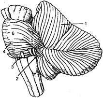 1 — мозжечок; 2 — мостомозжечковый треугольник; 3 — бульбарно-мостовая борозда; 4 – базилярная борозда; 5 — средняя мозжечковая ножка; 6 – мост.