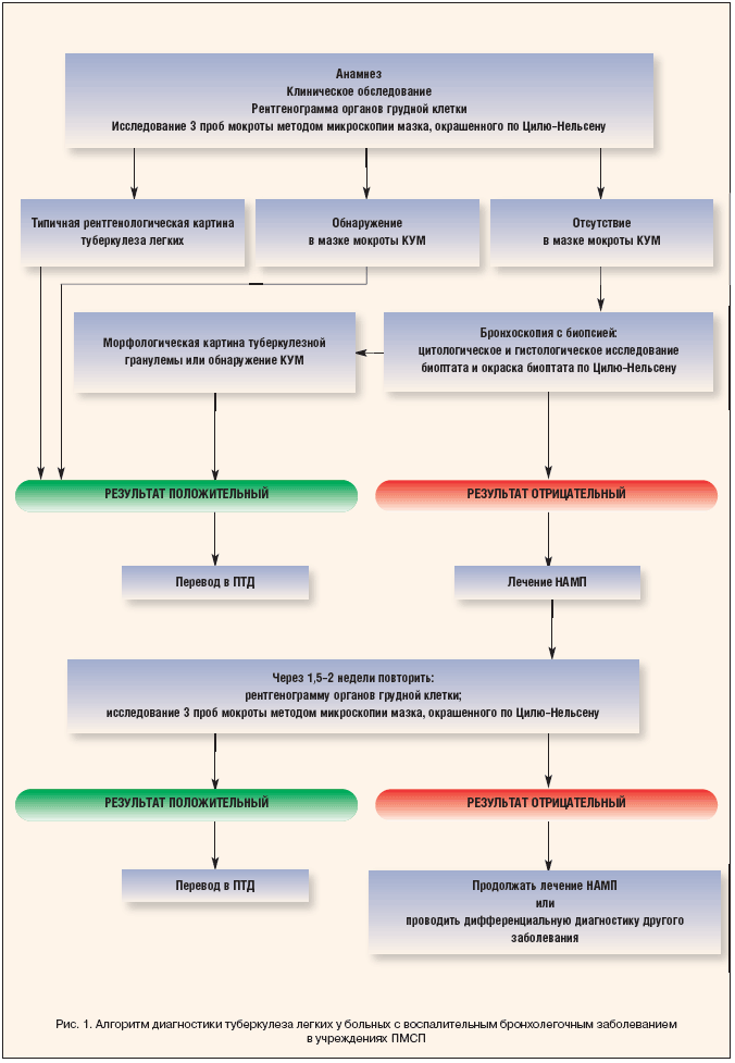 В условиях стационаров ПМСП, куда поступают больные с воспалительными бронхолегочными заболеваниями, для своевременного выявления туберкулеза легких используется весь арсенал современных лучевых исследований (компьютерная томография и др.) и бронхологических методов с цитологическим, гистологическим и микробиологическим исследованием полученного биоптата. Однако исследование мазков мокроты на МБТ методом микроскопии с окраской по Цилю – Нельсену должно являться обязательным диагностическим тестом. Микроскопическое исследование патологического материала остается пока наиболее быстрым, чувствительным и дешевым методом, позволяющим установить диагноз туберкулеза. Туберкулез – инфекционное заболевание, и только обнаружение МБТ делает диагноз абсолютно верным.