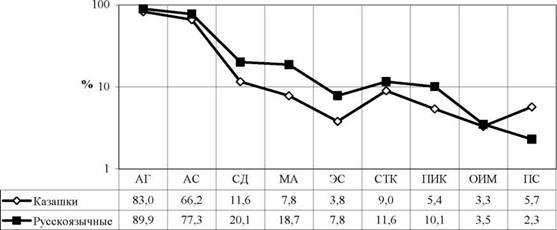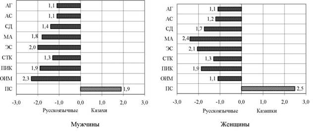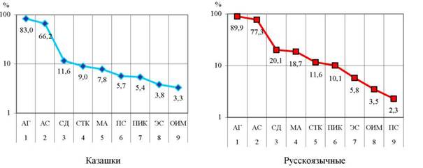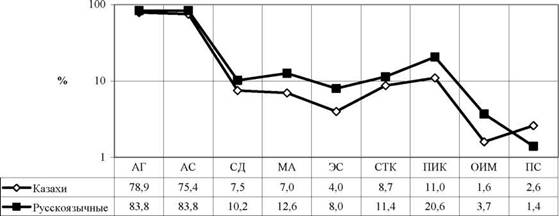 Анализ ранговой структуры распространенности отдельных патогенетических факторов у мужчин выявил, что независимо от этнической принадлежности три первых места в указанной последовательности занимают АГ, АС и ПИК. Различия в распространенности остальных шести патогенетических факторов у больных казахской и русскоязычной субпопуляций наглядно видны на рис.4.