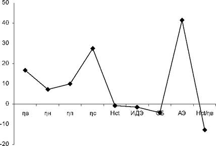 Рис. 1. Гемореологический профиль лиц с метаболическими расстройствами (показатели здоровых лиц - нулевая линия на графике)