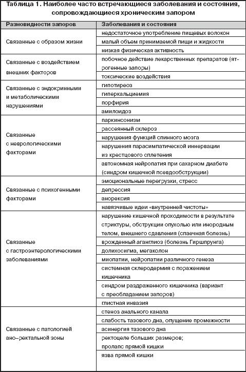 В таблице 1 представлены наиболее часто встречающиеся заболевания и состояния, сопровождающиеся хроническим запором. Питание играет важную роль в регуляции моторной функции кишечника. Длительное употребление механически щадящей, высококалорийной, малообъемной пищи, отсутствие в рационе продуктов, содержащих грубую клетчатку или пищевые волокна способствуют появлению запоров. Существуют продукты, которые обладают закрепляющим действием. Это крепкий кофе и чай, какао, творог, рис, гранаты, груши, айва, вяжущие продукты, шоколад, мучное. Неправильное питание и недостаточная физическая активность являются основной причиной запоров среди населения развитых стран.