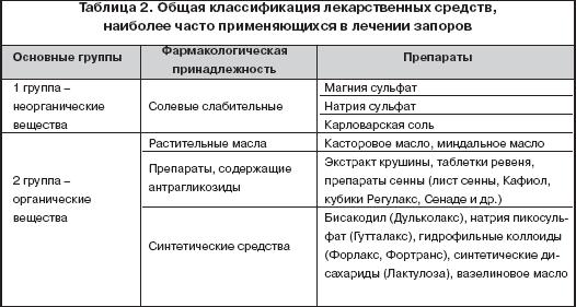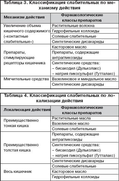 В таблице 2 представлена современная классификация лекарственных препаратов, применяющихся в лечении запоров, предложенная Д.А. Харкевичем (1999 г.) [4]. В основу классификации слабительных могут быть положены механизм и локализация их действия (таблицы 3 и 4) [2,4].