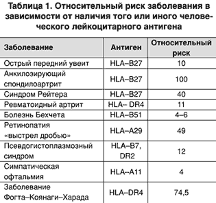 Наибольший теоретический и практический интерес для клиницистов представляют данные о связи некоторых заболеваний с наличием в генотипе того или иного человеческого лейкоцитарного антигена (HLA). Особенно это относится к заболеваниям с неизвестной этиологией, заболеваниям с тенденцией к хроническому течению и иммунологическим нарушениям. Они носят характер количественных корреляций, но это вовсе не означает, что человек, несущий специфичность HLA–В27, обречен на анкилозирующий спондилоартрит, однако вероятность того или иного заболевания среди лиц с разными генотипами HLA различна. Относительный риск определенных заболеваний у носителей некоторых генов возрастает в 1,7–90 раз (табл. 1).