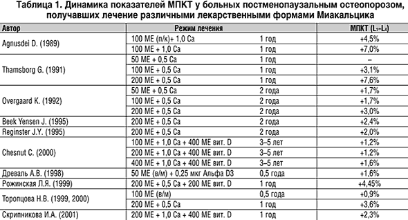 Так, имеется большое количество данных, подтверждающих положительное влияние терапии Миакальциком на МПКТ. Повышение МПКТ в поясничном отделе позвоночника (Л1–Л4) по сравнению с исходным уровнем составило, по данным различных авторов, от 1,7% до 8% [12–17]. Изучение влияния различных форм Миакальцика на МПКТ проводилось в нескольких центрах г. Москвы, полученные данные представлены в таблице 1. Отечественные результаты согласуются с данными, полученными зарубежными исследователями [18–21].