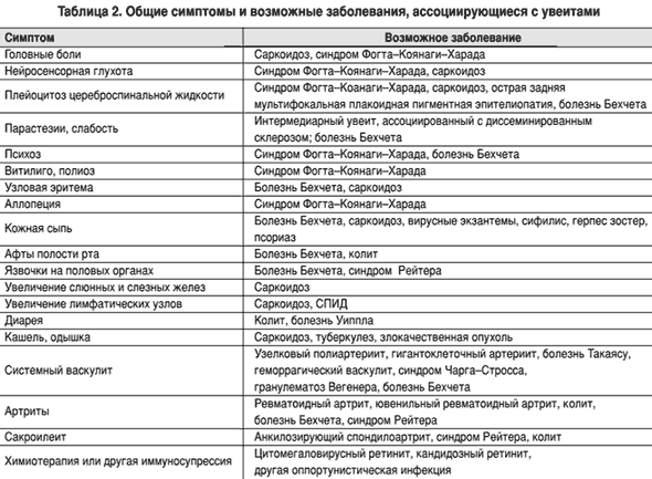 Офтальмологу следует помнить об общих симптомах, которые могут встречаться при заболеваниях, ассоциирующихся с увеитами (таблица 2).