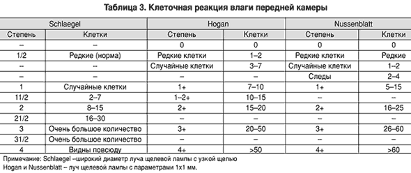 Клеточная реакция влаги передней камеры показывает активность воспаления радужки и цилиарного тела. Первично во влаге передней камеры появляются лимфоциты, однако может присутствовать и достаточное количество лейкоцитов. Степень клеточной реакции, согласно данным различных авторов, представлена в таблице 3.