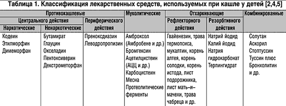 Детальная характеристика симптома кашля (частота, интенсивность, тембр, периодичность, болезненность, продуктивность, характер мокроты, время появления и его продолжительность и др.), наряду с уточнением анамнеза и адекватной оценкой результатов клинического обследования позволяют установить правильный диагноз и назначить адекватную терапию [1,5,9]. В качестве симптоматического лечения при этом нередко используются препараты, влияющие на частоту, интенсивность и характер кашля [3,4,7]. В зависимости от фармакодинамики среди них выделяют противокашлевые, муколитические и отхаркивающих лекарственные средства (табл. 1). При этом рациональное их применение требует строго дифференцированного подхода к каждой клинической ситуации. Выбор конкретных лекарственных средств зависит от клинических и патогенетических особенностей заболевания, индивидуальных особенностей ребенка, а также от фармакологических характеристик самих препаратов [1,3–7].