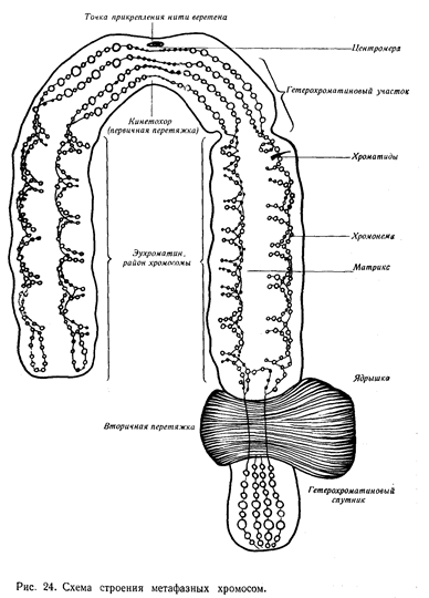 Уже в профазе митоза видно, что хромосома образована двумя взаимно переплетающимися нитями одинакового диаметра — хроматидами. В метафазе хромосома уже спирализована, и две ее хроматиды ложатся параллельно, разделенные узкой щелью. Каждая хроматида состоит из двух полухроматид. В результате митоза хроматиды материнской хромосомы становятся сестринскими хромосомами, а полухроматиды — их хроматидами. В основе хроматид лежат хромонемы — так называют более тонкие нити ДНП, состоящие из белка и нуклеиновых кислот.