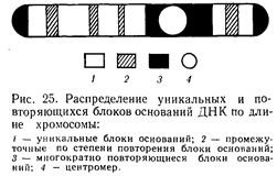 Достаточно полное освещение вопросов молекулярной генетики и хромосомной организации в многочисленных специальных монографиях и руководствах (С. Е. Бреслер, 1973; И. П. Ашмарин, 1974; Г. Стент, 1974, и др.) исключают необходимость подробного рассмотрения этих вопросов в данной книге. Сравнительно новый молекулярный аспект хромосомной организации возник в связи с разработкой методов фракционирования тотальной ДНК генома по повторяемости сходных нуклеотидных последовательностей и методов гибридизации нуклеиновых кислот на хромосомных препаратах. Эти методы открыли возможность выяснения локализации разных фракций ДНК в хромосомном наборе. Важными находками, полученными в этой новой области, пограничной между молекулярной и цитологической генетикой, были: а) обнаружение в геноме эукариотов, помимо ДНК с уникальными последовательностями, большой доли ДНК с одинаковыми или близкими последовательностями нуклеотидов, повторяющимися многие сотни и тысячи раз (Г. П. Георгиев, 1973; С. А. Лимборская, 1975); б) обнаружение неравномерной локализации ДНК с разными характеристиками в хромосомном наборе: ДНК с наибольшим числом повторяющихся последовательностей локализуется в гетерохроматиновых районах хромосом.