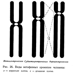 У человека на идиограмме среди 46 хромосом различают три типа хромосом в зависимости от положения в хромосоме центромер: