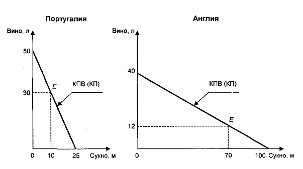 На данном графике лучи С и С2- показатели сравнительных издержек производства товаров. Угол С20С- это зона относительных цен на сукно и вино. А и В- это кривые спроса для каждого государства. Е – это точка равновесия.