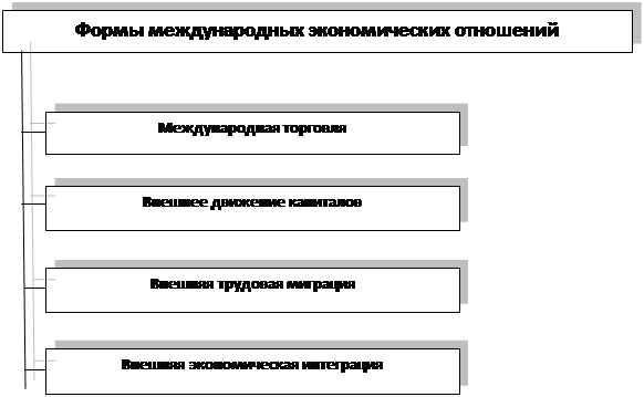 К главным формам международных экономических отношений относятся: международная торговля, внешнее движение капиталов, внешняя трудовая миграция, внешняя экономическая интеграция.