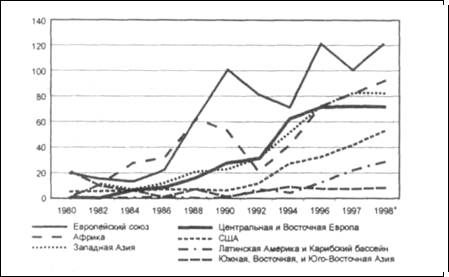 Рис.2. Инвестиционные потоки по основным регионам мира, 1980-1998 гг., млрд. долл.