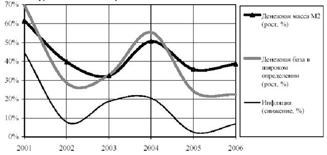 Приложение 13 [18] «Темпы роста денежной базы в широком определении и денежной массы М2 и уровень снижения инфляции»