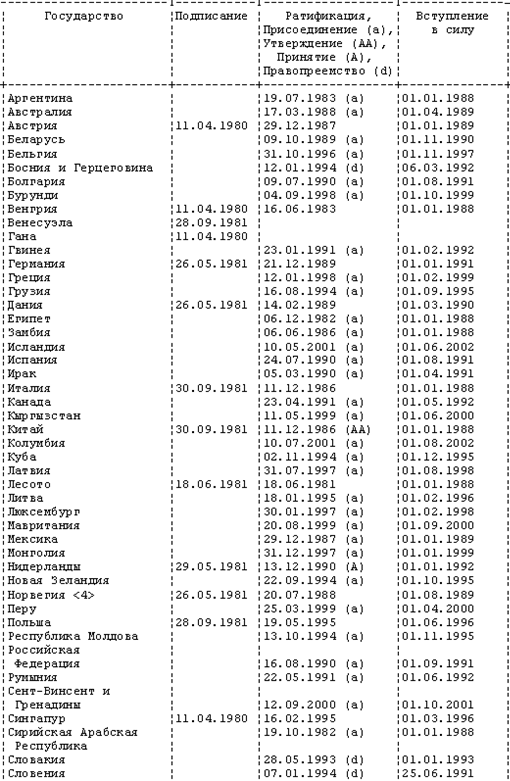 Венская конвенция 1980 г. Конвенция вступила в силу с 1 января 1988 г. Состоит из четырех частей, включающих в общей сложности 101 статью. Она регулирует отношения по вопросам, связанным как с заключением договоров международной купли-продажи товаров, так и с их исполнением и ответственностью за неисполнение или ненадлежащее исполнение.