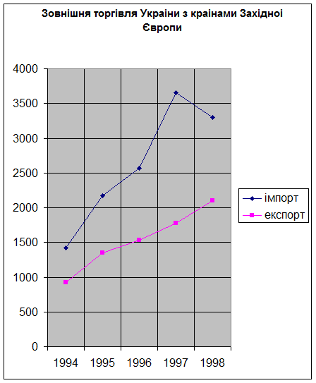Західна Європа є одним з головних торговельних партнерів України, Експорт до ЄС становив 1998 р. понад $3,3 млрд., імпорт - $2,1 млрд. Цей показник спіівмірний з підсумками зовнішньоторговельних операцій України з країнами СНД. Але якщо негатив в обмінах із СНД обумовлений імпортом енергоносіїв, то європейський негатив є результатом недоліків нашої зовнішньоторговельної політики в цілому, а конкретно - пасивністю експортного сектора, його неготовністю працювати за конкретних умов, перевантаженістю експорту бартерними операціями, неадекватним менеджментом.