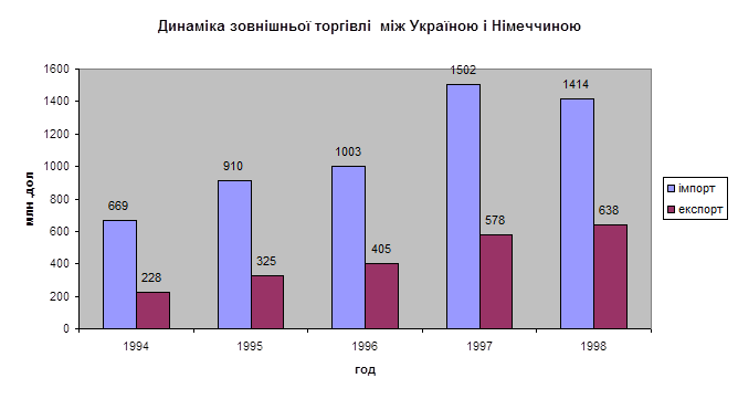 У галузі зовнішньої торгівлі Німеччина була і залишається одним з найважливіших партнерів України, на неї припадає близько 7% загального обороту нашої держави. За підсумками 1998 р. Україна увійшла до десятки головних торгових партнерів Німеччини у Центральній та Східній Європі й впевнено посідає друге місце піісля Російської Федерації. Досягнутий рівень взаємної торгівлі ( 2 млрд.дол) є найвищим за весь час існування незалежної Української держави, хоча й досить скромним порівняно із загальними обсягами німецької зовнішньої торгівлі, де наша частка становить лише 0,2 %.